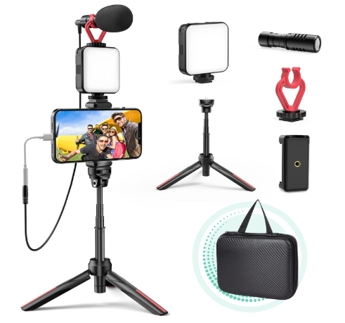 OBJLGEV Video Vlogging Kit with LED & Microphone is a vlogging kit that includes LED adjustable light, good quality microphone, extendable tripod, phone holder, and a carry bag.